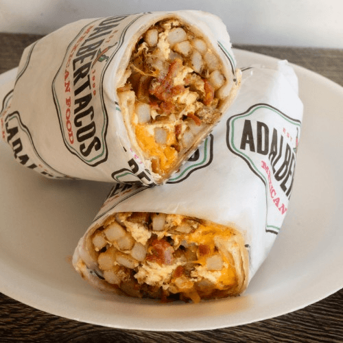 Scrambled eggs, crispy bacon, crispy potatoes, and fresh cheddar cheese all wrapped in a soft flour tortilla