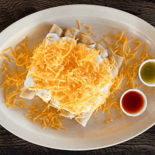 5 rolled tacos with your choice of either chicken or beef topped with a generous amount of cheese and sour cream