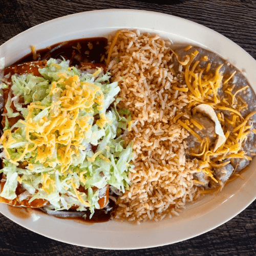 One cheese or chicken enchiladas topped with crisp lettuce and covered in our rich enchilada sauce all served witha side of seasoned rice and refried beans