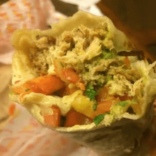 Choice of meat, rice, beans, sour cream, guacamole, Mexican salsa, and cheese all wrapped in a soft flour tortilla