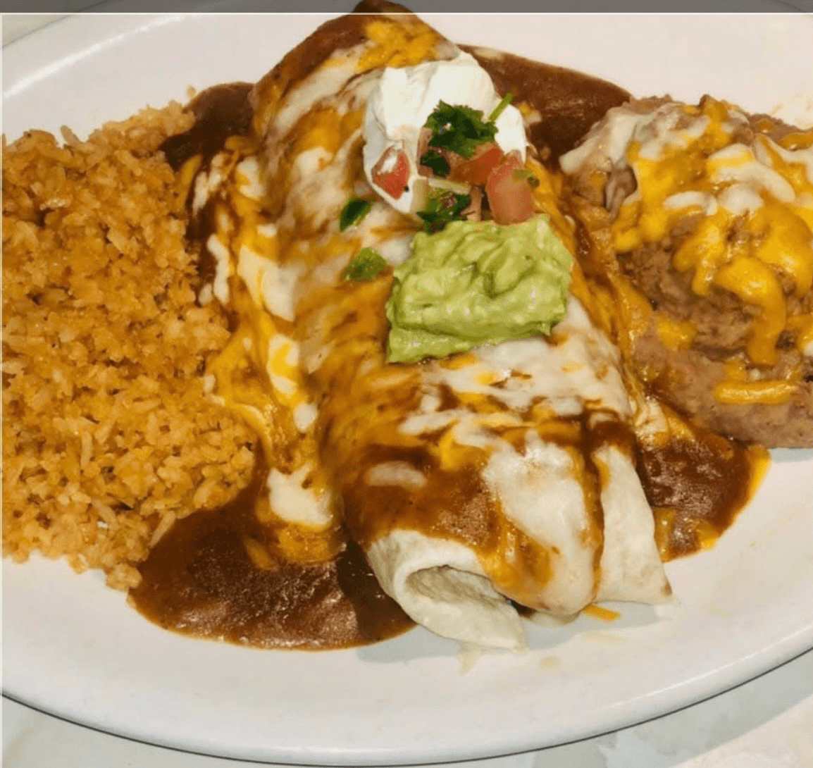 Large flour tortilla with sliced marinated carne asada, with grilled onions and cheese. Served with guacamole, sour cream and smothered in a delicious red sauce