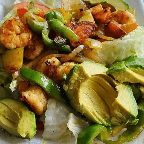 Grilled shrimp on a bed of lettuce, tomatoes, cheese, and choice of sliced avocado or guacamole