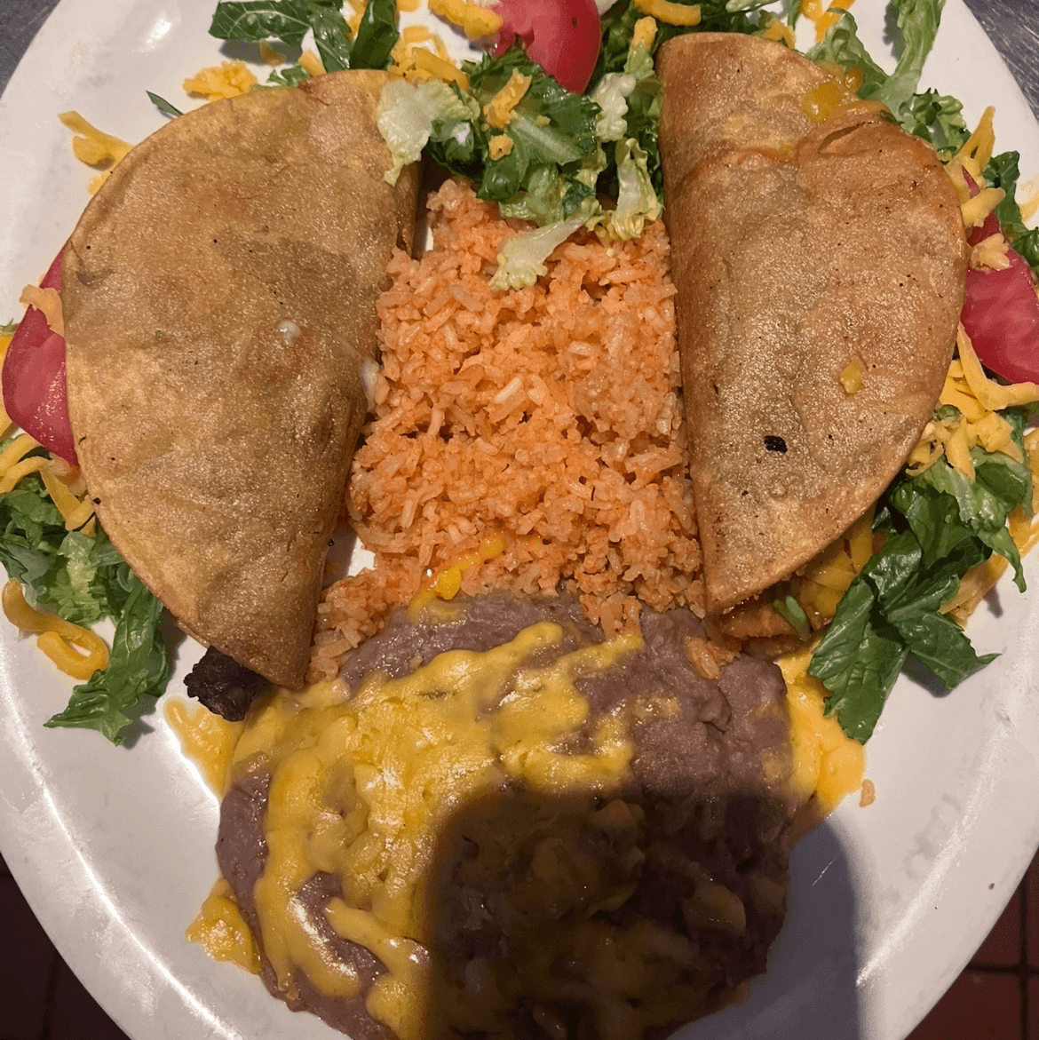 1 beef taco, 1 cheese enchilada, steak ranchero, Spanish rice, refried beans, green salad and homemade flour tortillas