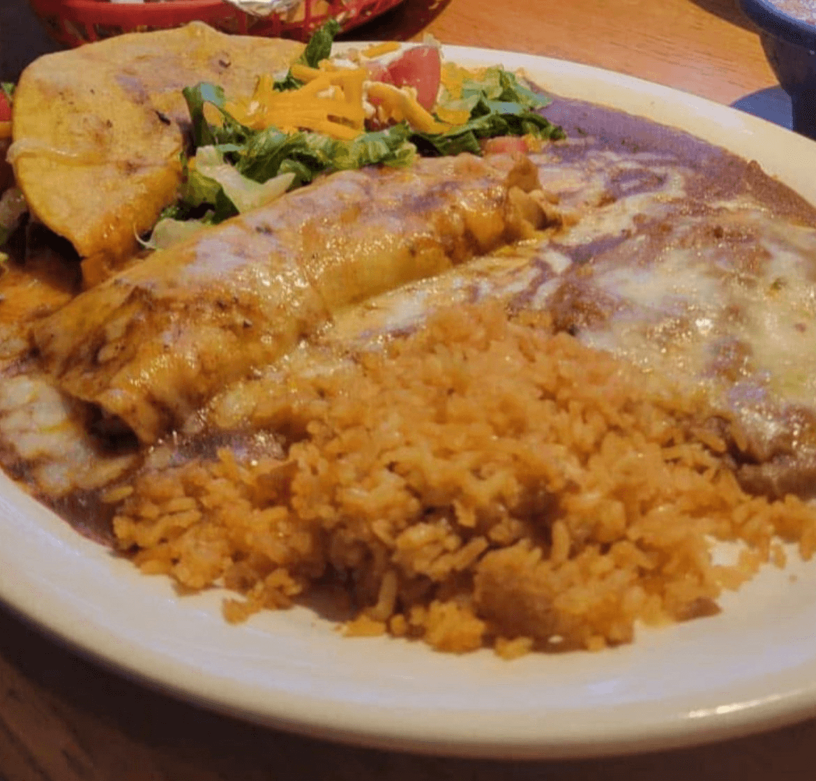 Two soft corn tortillas filled with steak colorado, chicken, carnitas, cheese or shrimp covered with our mouth- watering homemade enchilada sauce