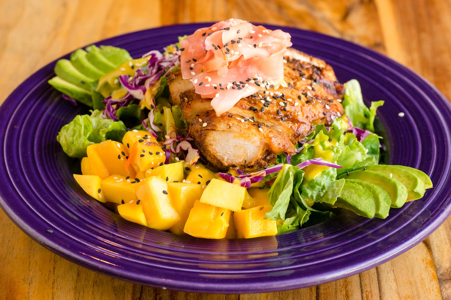 Grilled chipotle glazed chicken breast over a bed of mixed greens with avocado, seasonal fruit, black beans, red cabbage, sesame seeds, pickled ginger, and our mango-lime dressing