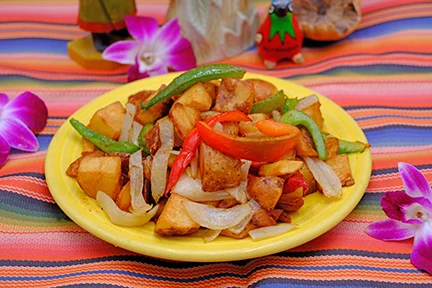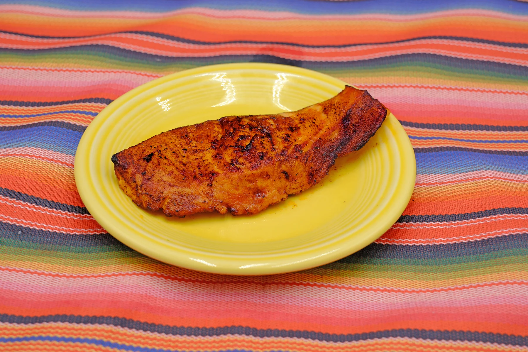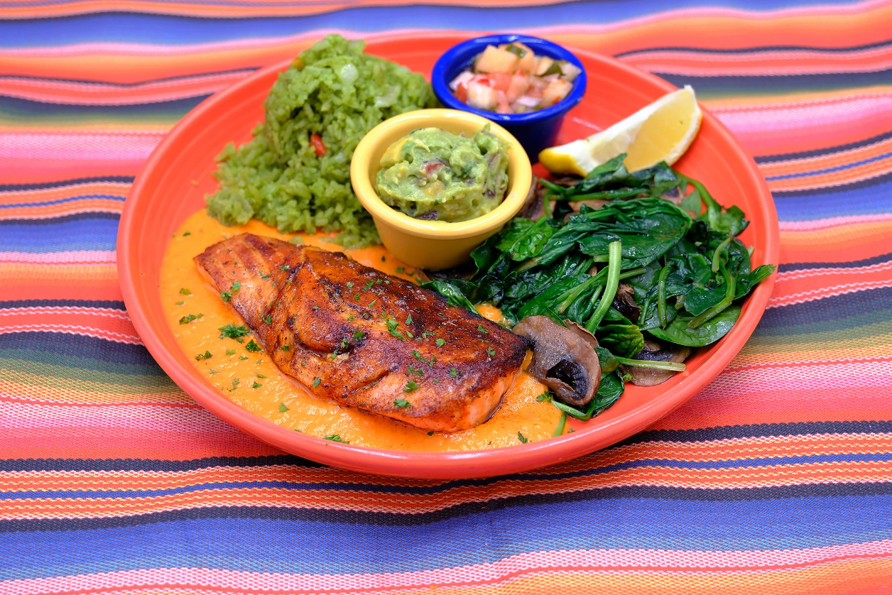 Red chili crusted North Atlantic salmon pan-seared and placed over a mango and roasted bell pepper sauce. Served with sauteed baby spinach and mushrooms, cilantro rice, Polynesian guacamole and pineapple salsa
