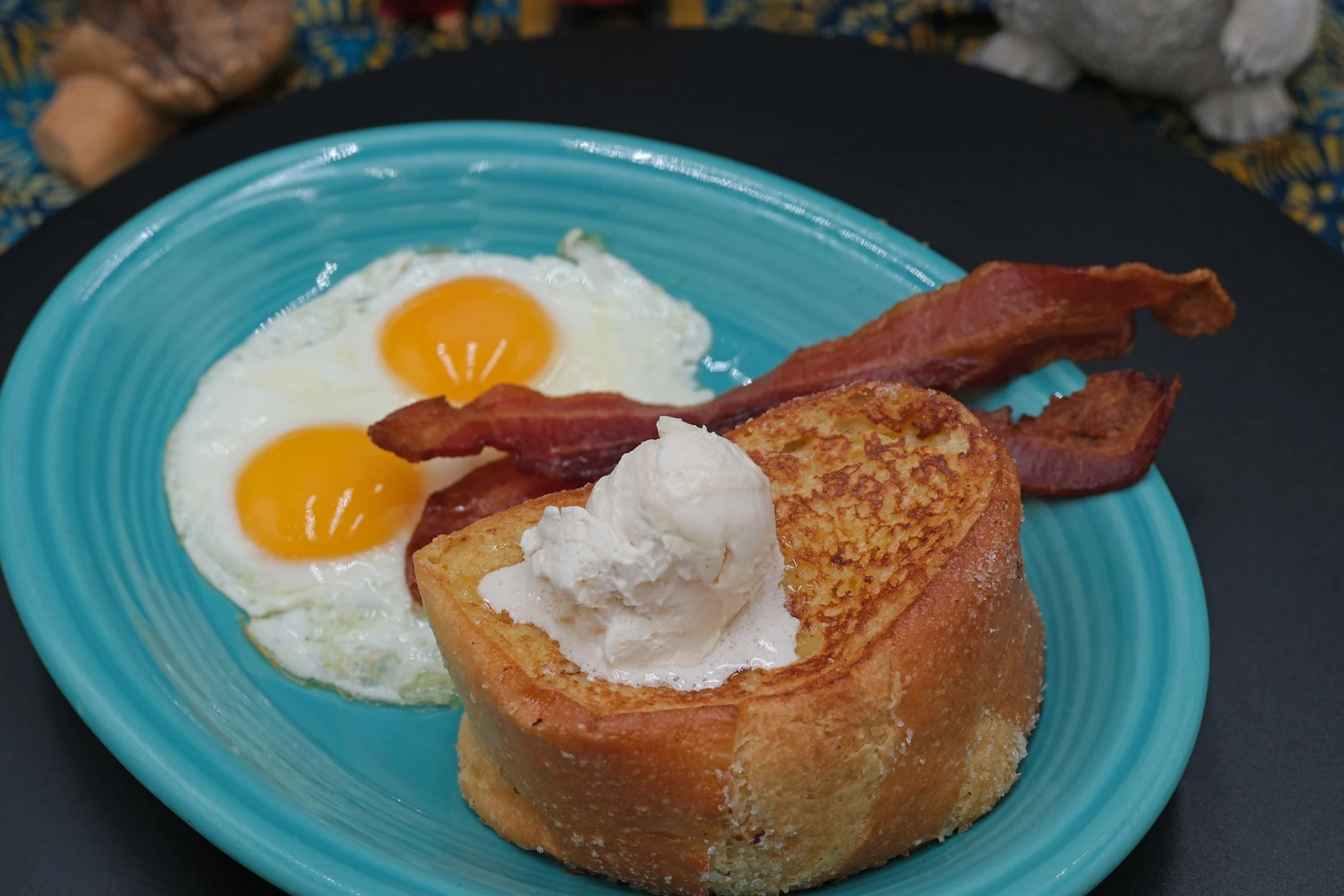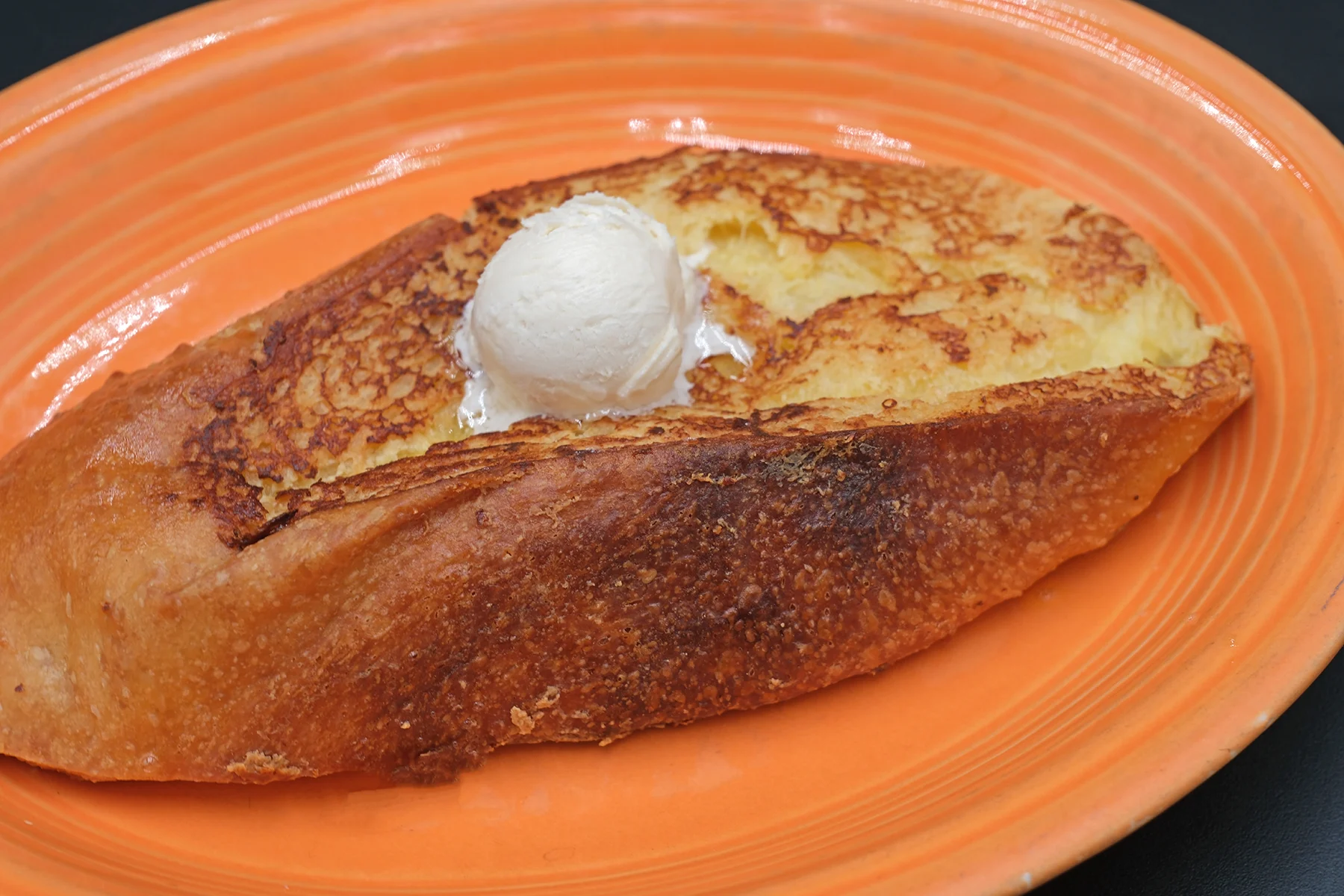 Our famous secret recipe of custard soaked French bread topped with in-house whipped maple butter.