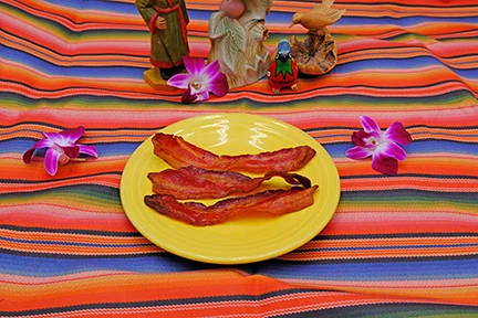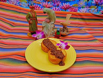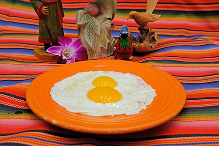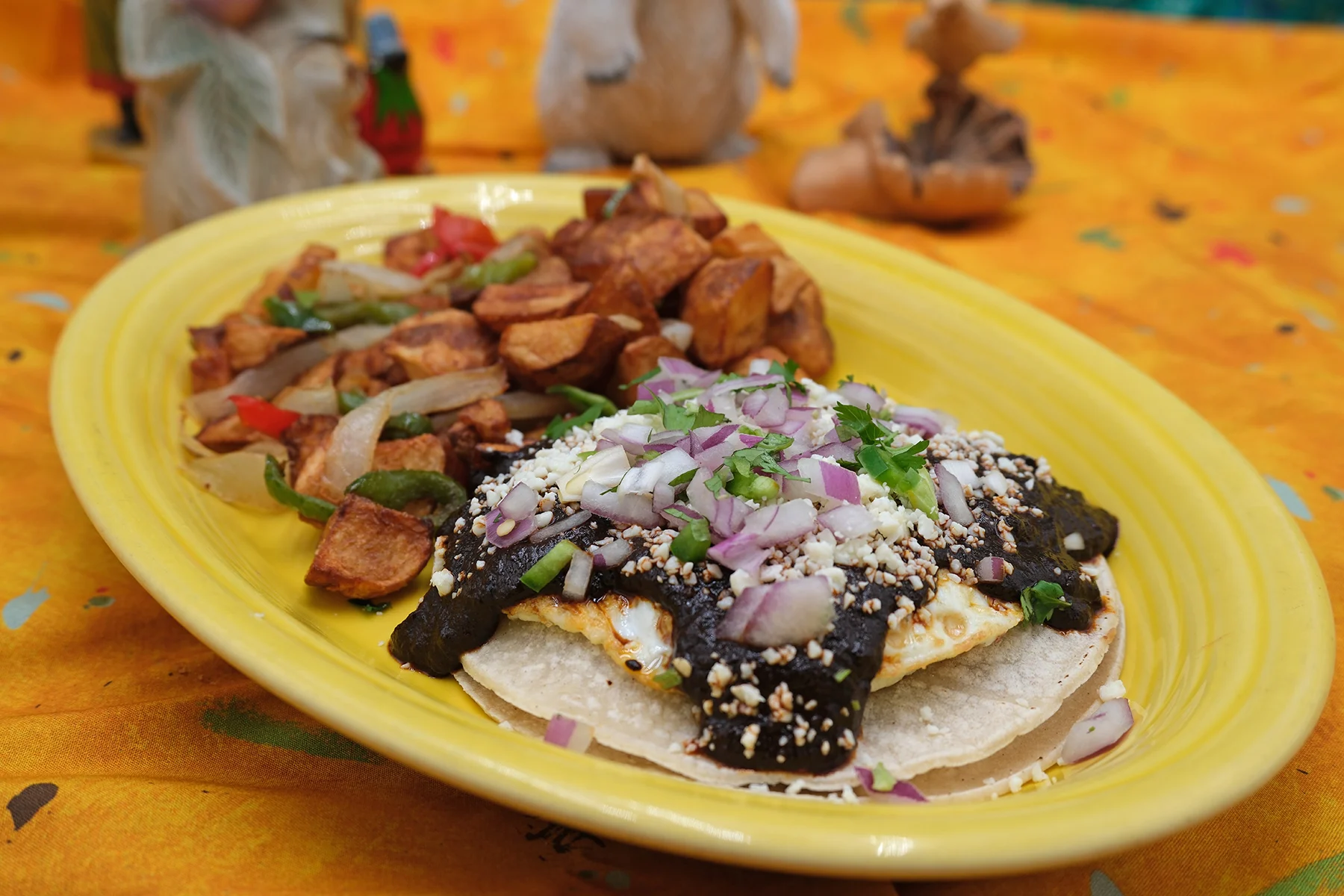 Two eggs cooked over-medium* and layered on two corn tortillas with refried beans and topped with Piag's house-made Oaxacan mole sauce, cotija cheese, onions, cilantro and jalapeno (contains chicken broth)