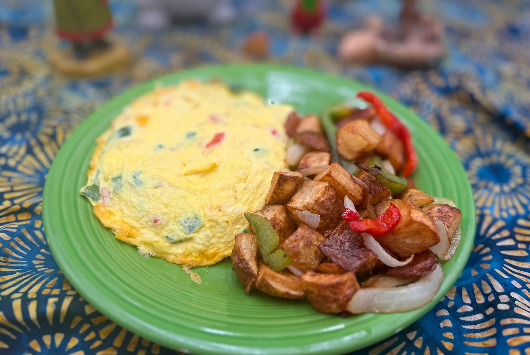A three-egg omelet with sauteed onions, bell peppers, in-house diced, uncured, Applewood smoked ham and cheddar cheese.