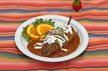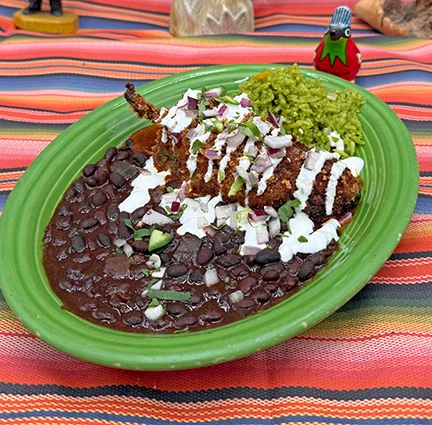 One large Pasilla chili filled with Monterey jack cheese, toasted pumpkin seeds, currants and cilantro rolled in panko and deep fried until crispy and golden. Served with our house-made Oaxacan sauce, sour cream, cilantro rice and pinto beans with a jalapeno-cilantro-onion garnish