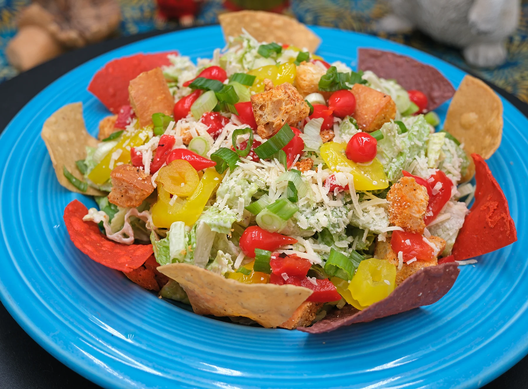 Tijuana style salad of romaine lettuce, green onions, parmesan, sweet drop peppers, roasted red bell peppers, banana peppers, caesar dressing, tortilla chips, and house-made croutons