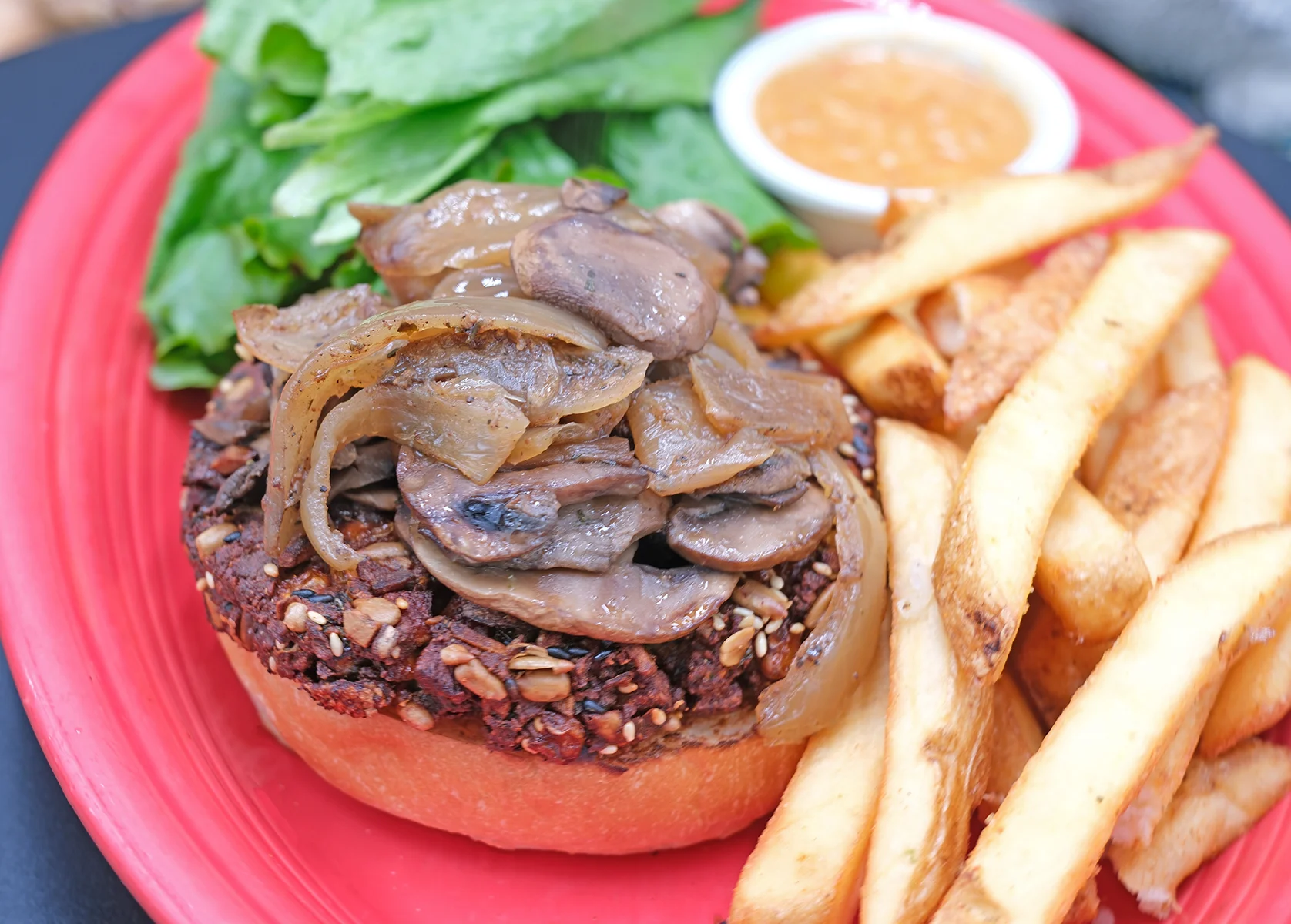 A house-made falafel style patty of ground peas, sweet potato, garbanzo beans, and corn mixed with African spices and encrusted with sesame and sunflower seeds. Served with lettuce, onion marmalade, truffled mushrooms, and a side of cashew curry sauce.