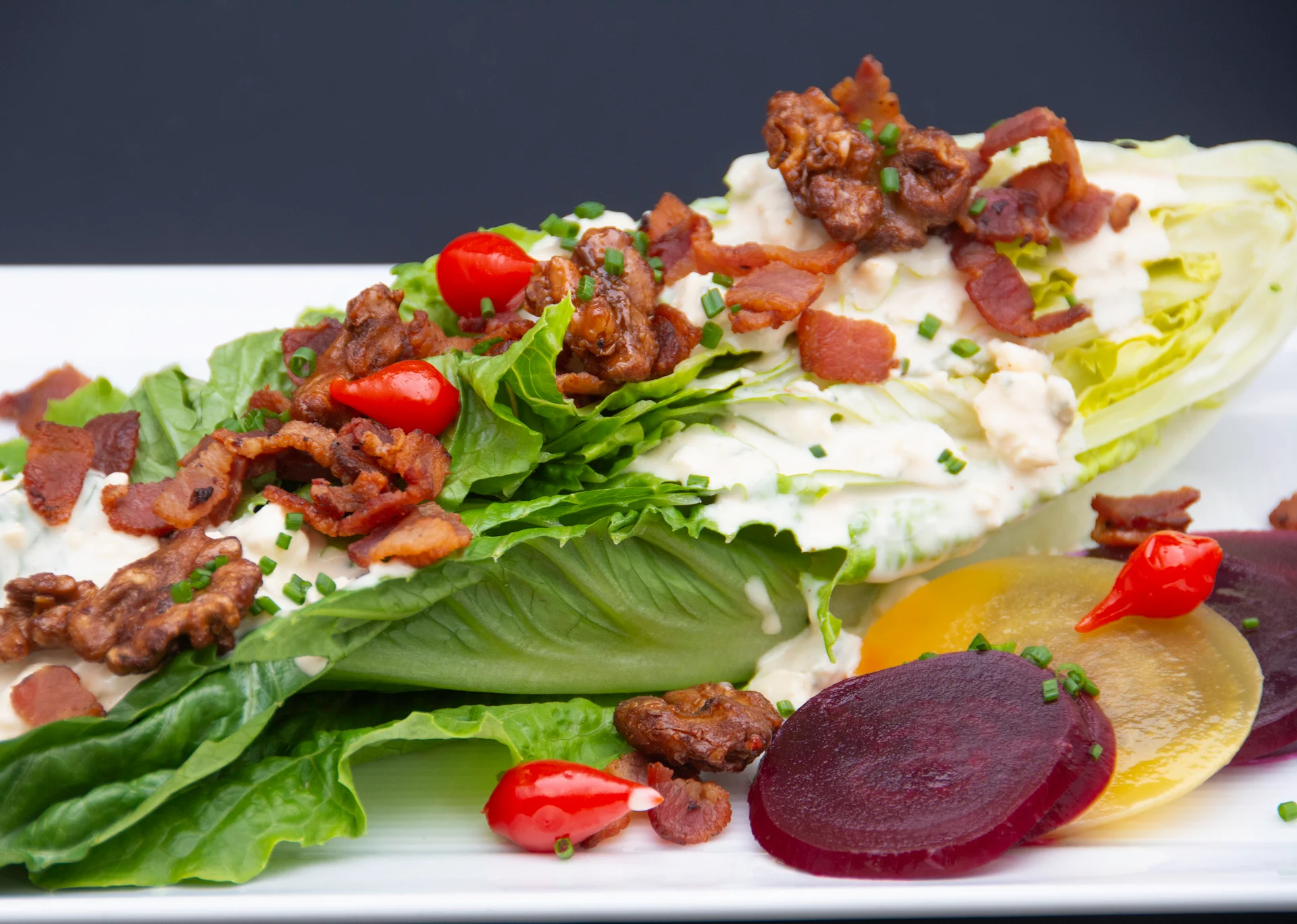 Romaine wedge topped with our creamy blue cheese dressing, bacon, scallions, roasted red bell peppers, candied walnuts, and pickled beets