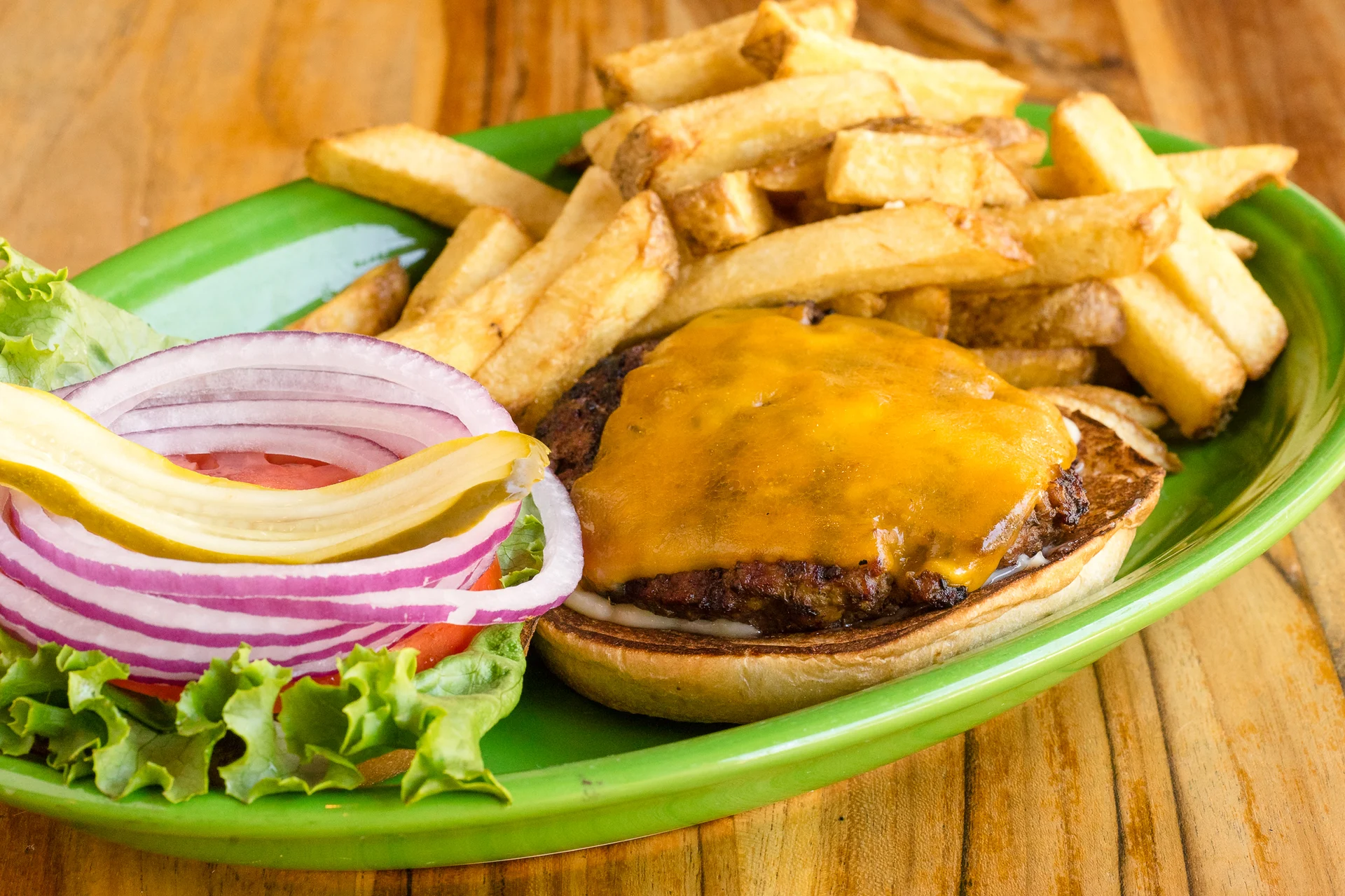 The classic half pound choice Angus ground chuck beef burger* with cheddar cheese, tomato, onion, lettuce, pickles, and mayo