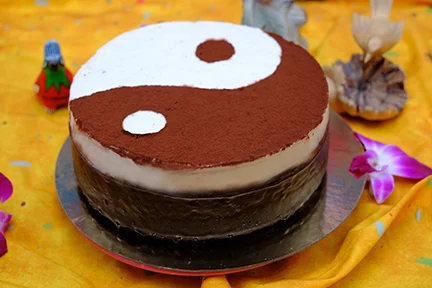 Rich chocolate cheesecake and vanilla mousse sitting on chocolate cookie crust and glazed with a bittersweet chocolate band