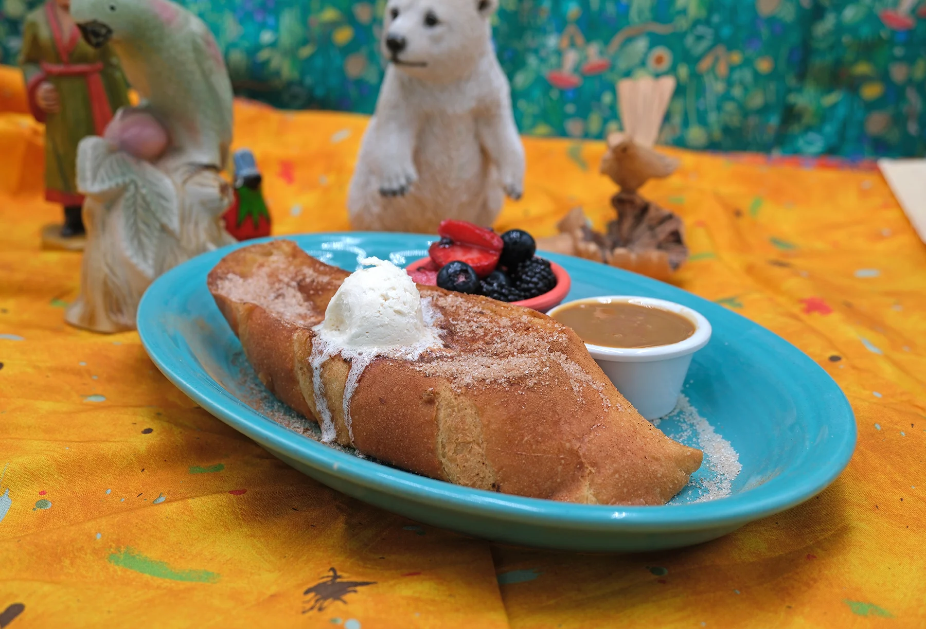 A slice of our house made custard-soaked Famous French Toast. Coated with cinnamon sugar and served with maple butter, Mexican cajeta and mixed berry compote on the side.