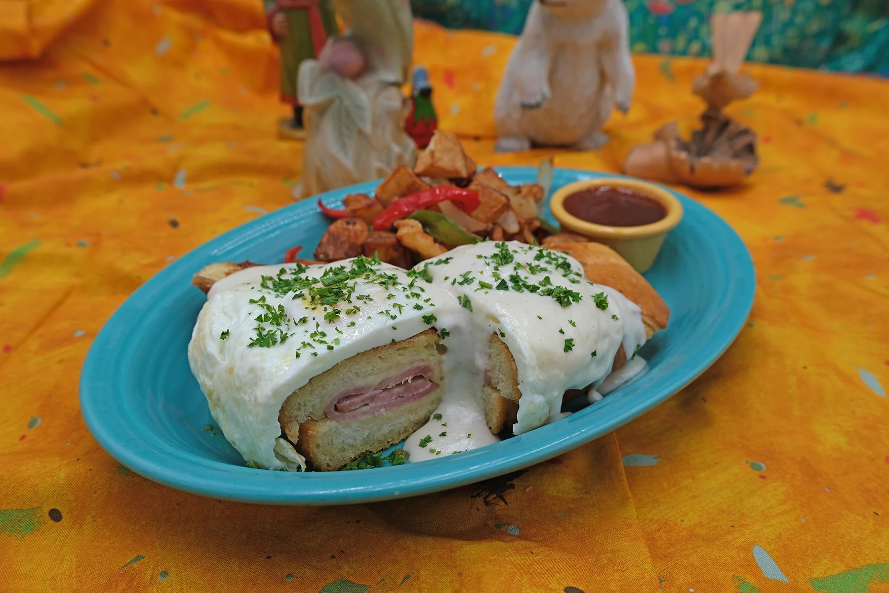 Our Famous French Toast stuffed with uncured Applewood smoked ham and Swiss cheese and then topped with two over-medium* eggs and our creamy house-made bechamel sauce. Garnished with parsley and served with chipotle-raspberry jam