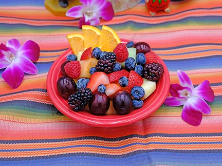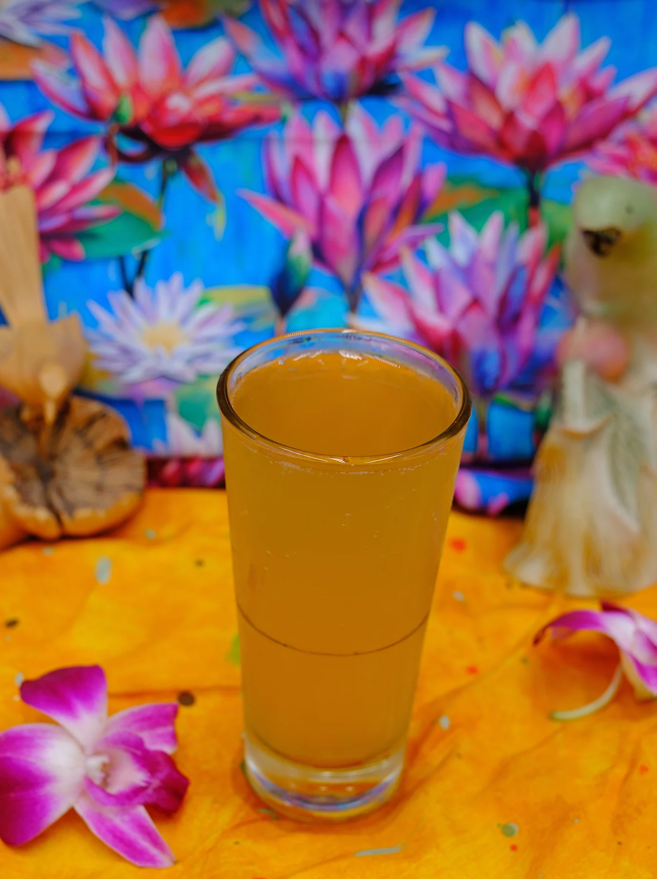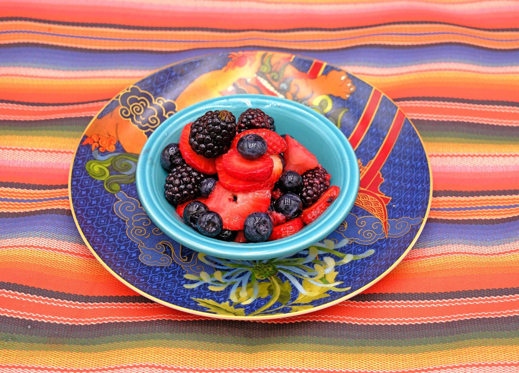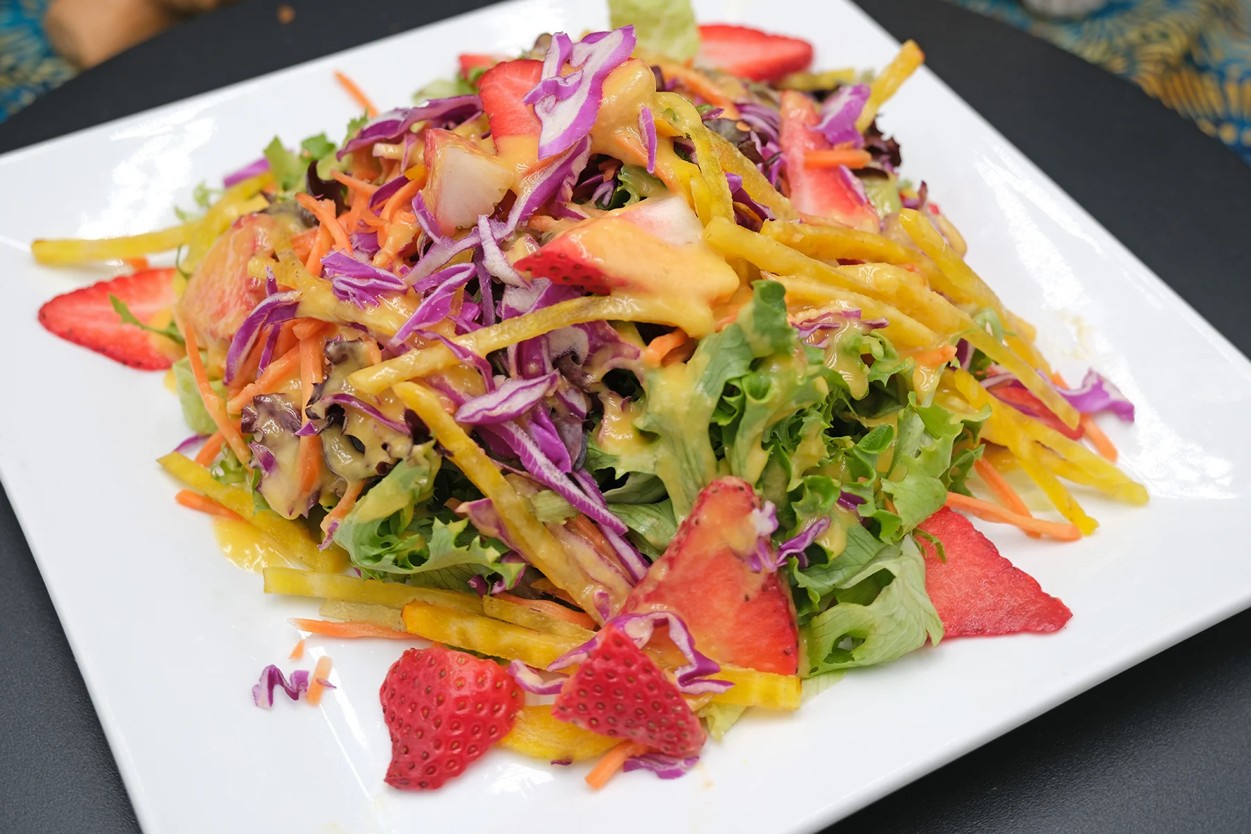 Mixed greens with shredded cabbage, carrots, and raw gold beets. Dressed with our mango-lime dressing and strawberries