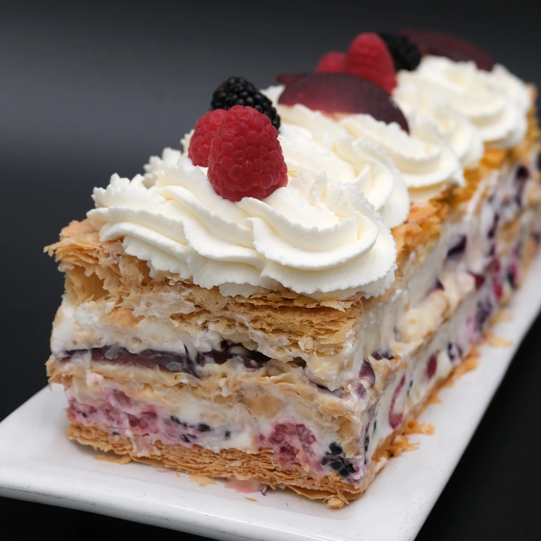 Layers of puff pastry filled with pastry cream, fresh seasonal fruit and whipped cream