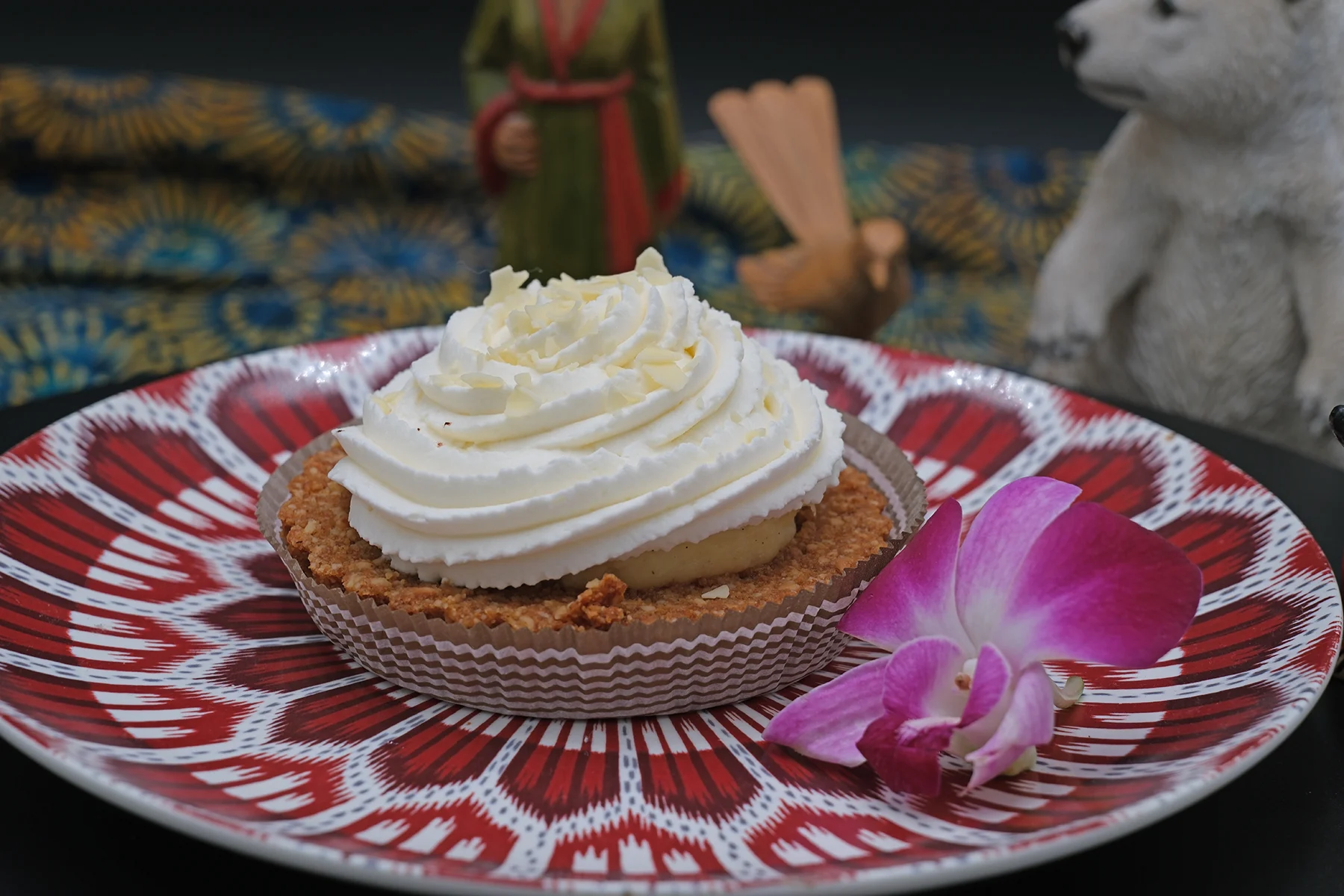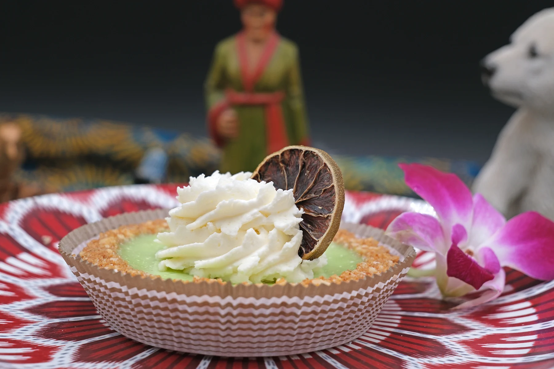A tart filling with fresh lime juice in a cashew-graham crust topped with whipped cream (contains nuts)