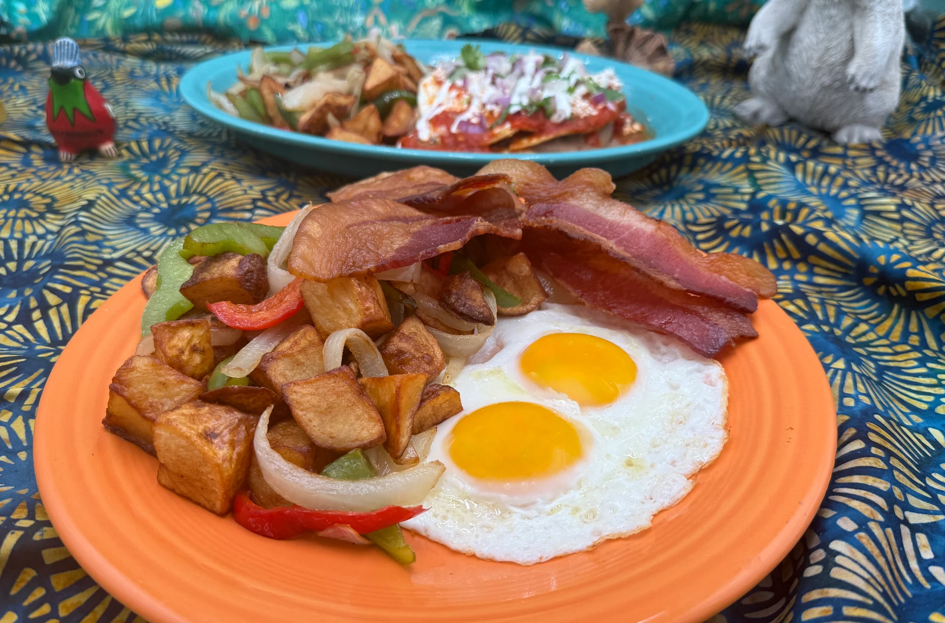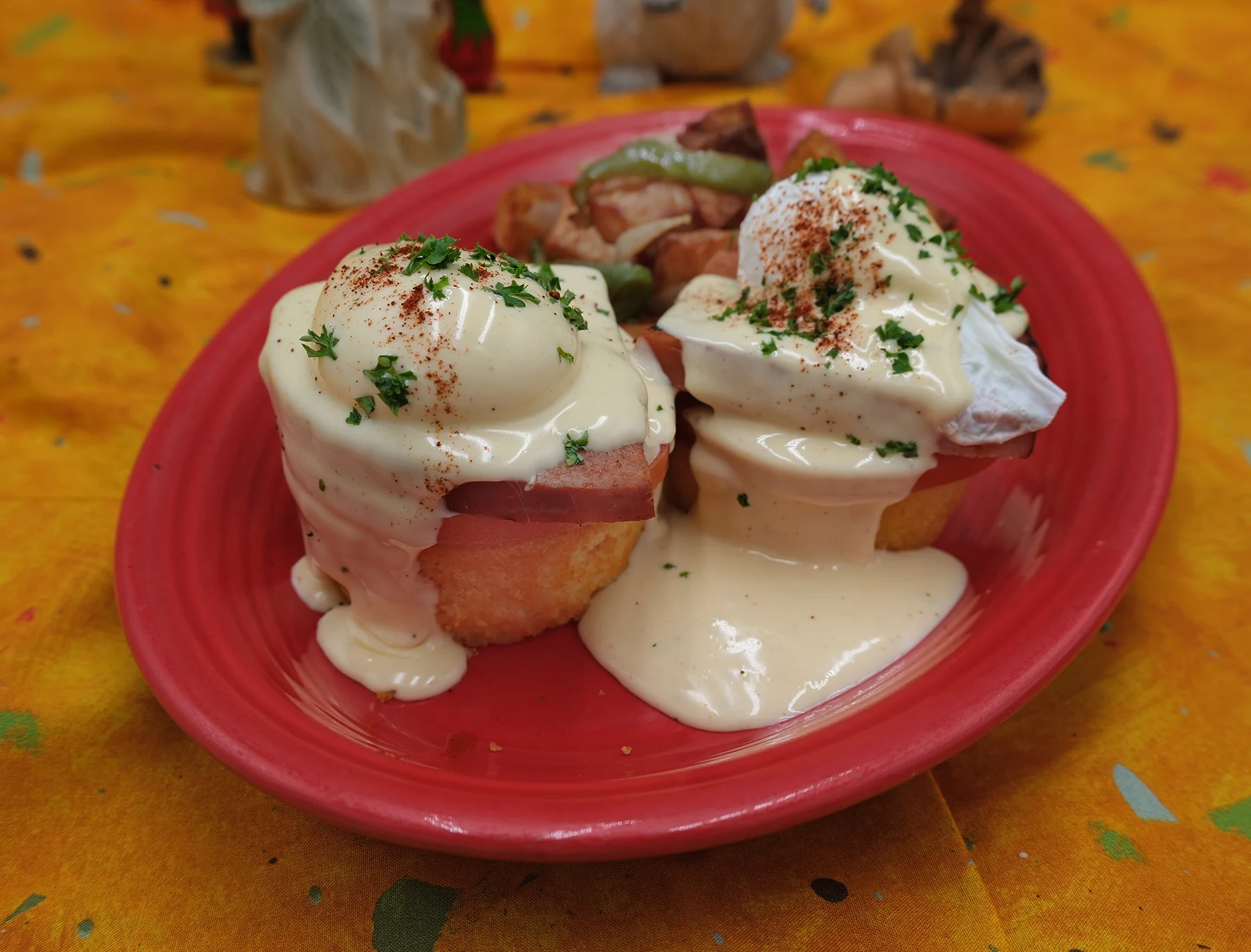 Chunks of corned beef sauteed with potatoes, onions, and bell peppers, topped with two eggs any style and smoky hollandaise.