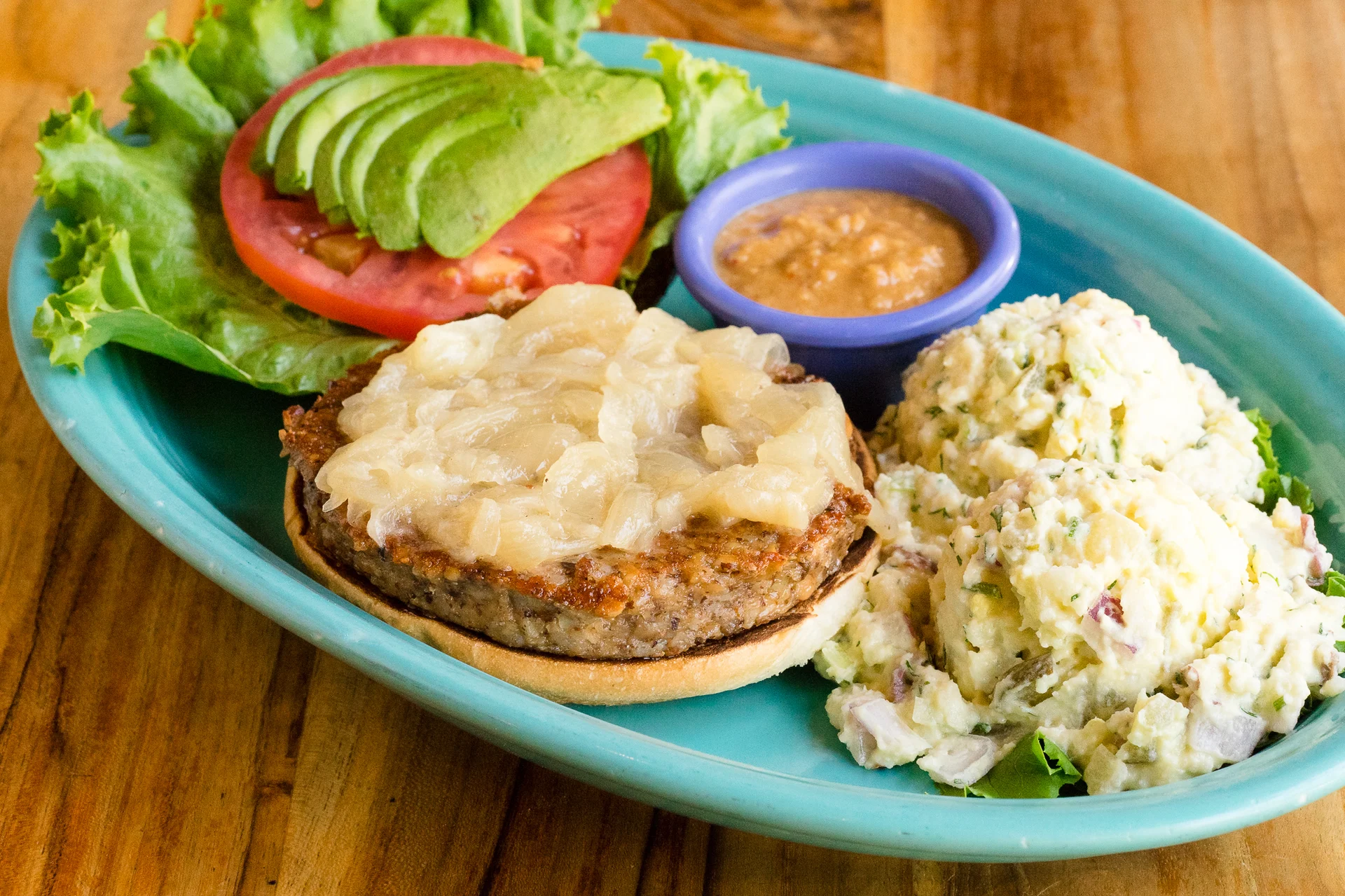 A grilled house-made vegetarian patty of roasted pecans, almonds, walnuts, caramelized onions, rice, Gouda cheese, mushrooms, and spices. Served with lettuce, onion marmalade, avocado, mayo, and a side of cashew curry sauce