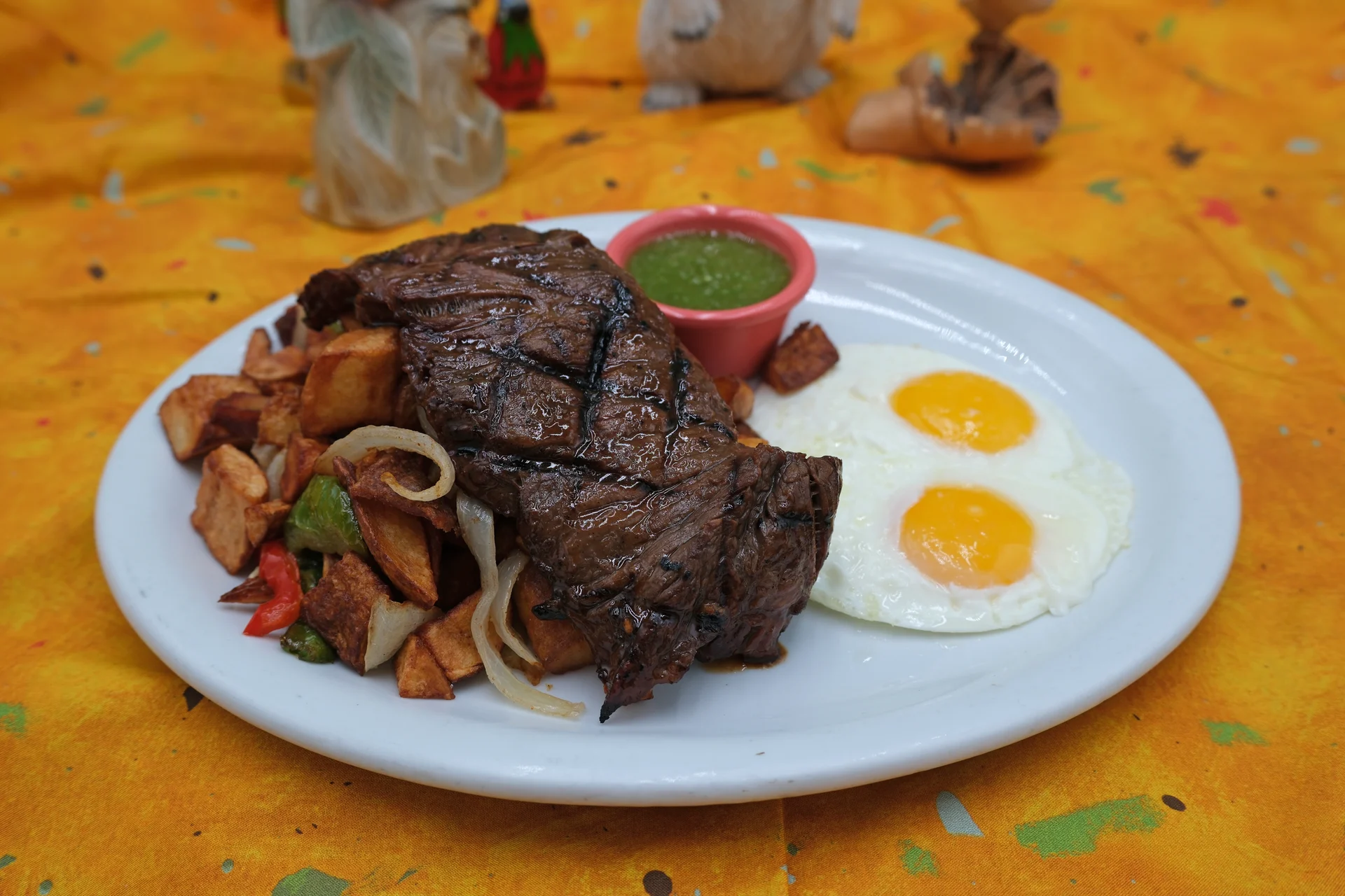 Skirt steak marinated in a ginger, garlic and plum sauce and then grilled and served with two eggs any style* and paired with a side of cool spice sauce