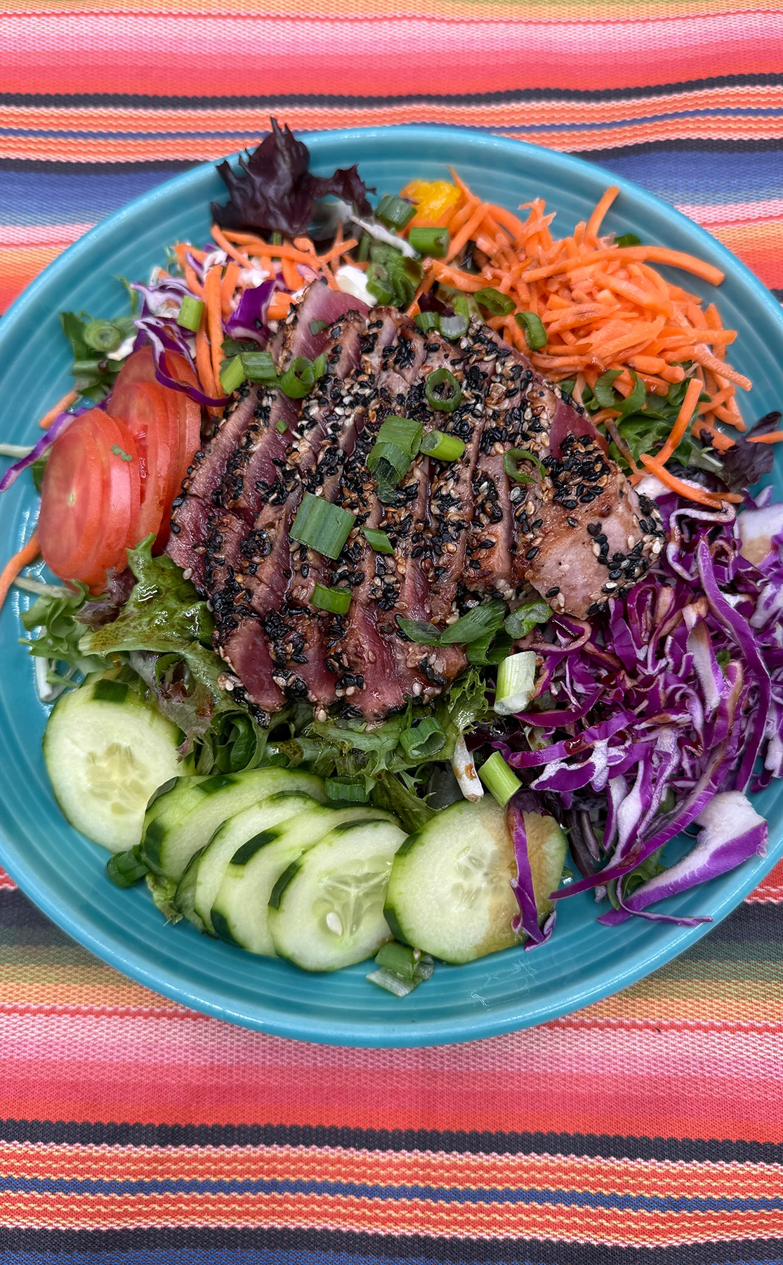 Pan-seared sesame-crusted ahi tuna served over spring mix with cucumber, tomatoes, shredded carrots, cabbage, and a soy-balsamic vinaigrette.