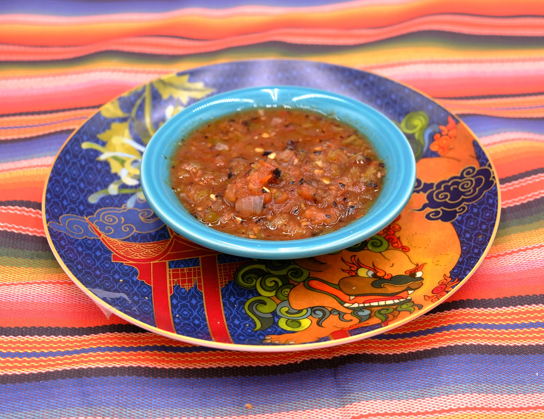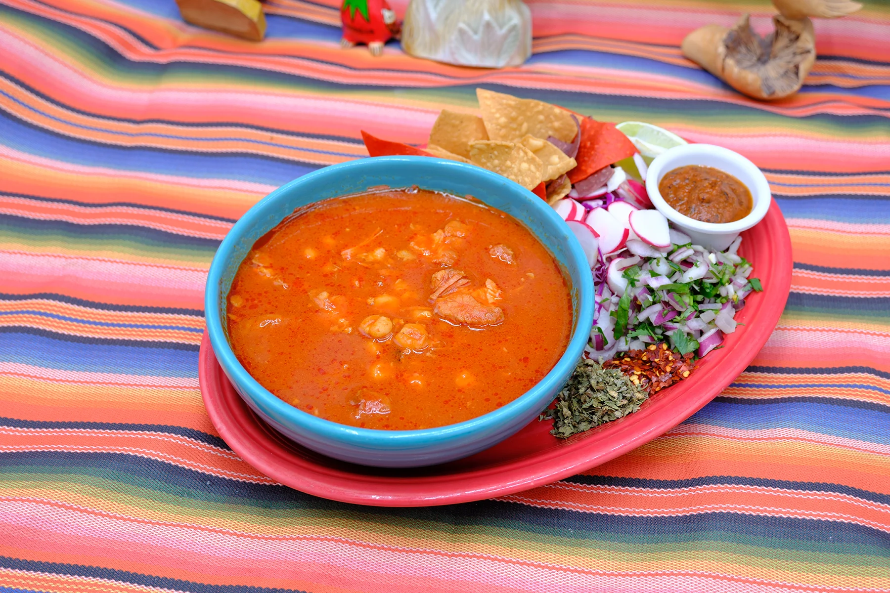 Traditional Mexican soup made with roasted pork and hominy slow-cooked in a chili broth. Served with shredded cabbage, radish, lime, cilantro, onion, oregano, Fuego salsa, and crispy tortillas.