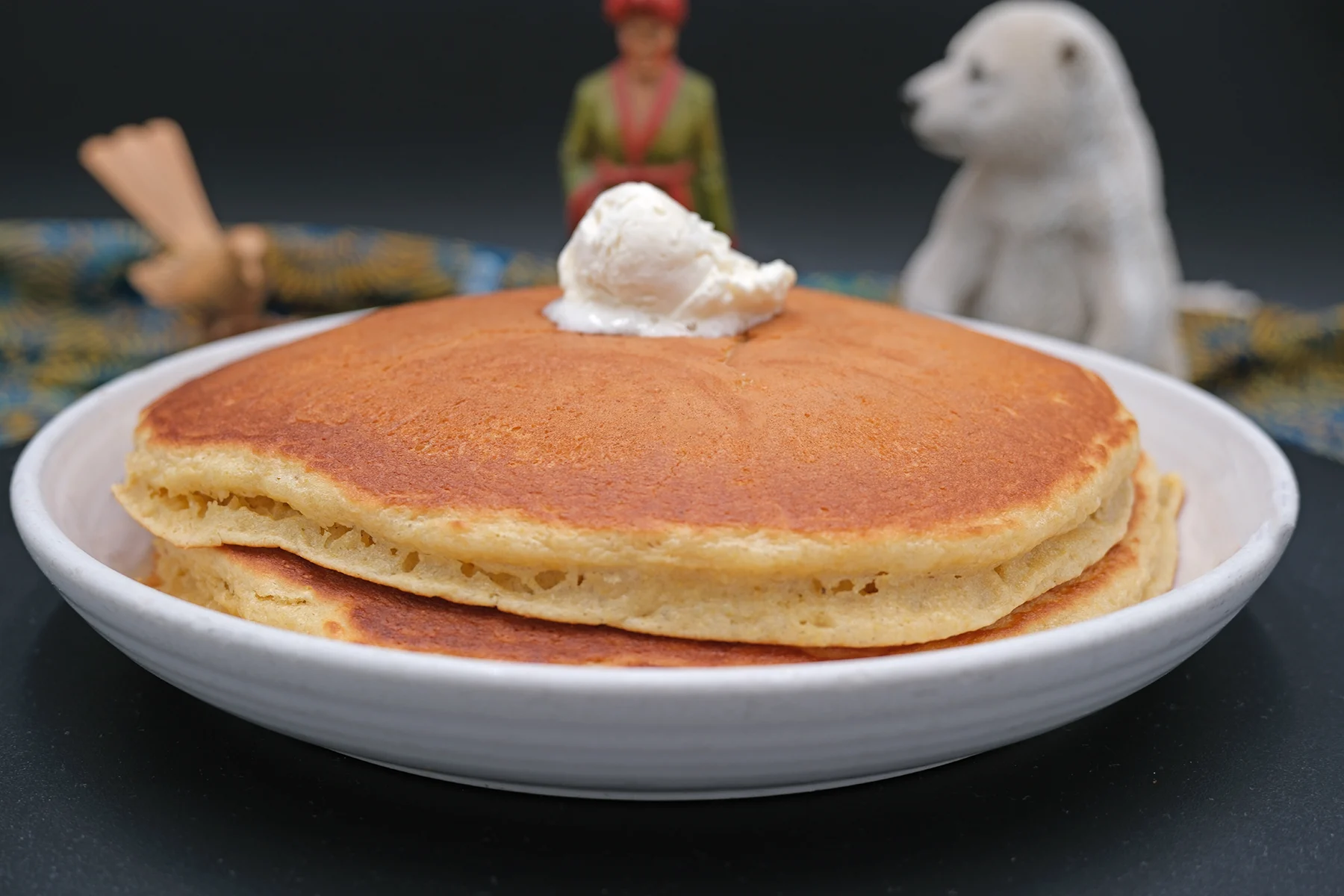 Golden buttermilk blueberry cornmeal pancakes with corn inside topped with in-house whipped maple butter