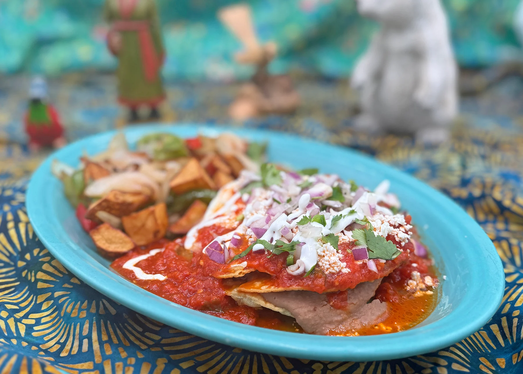 Two crispy corn tortillas with our refried beans, two over-medium eggs, ranchero sauce and salsa verde. Topped with panela cheese, onions, cilantro, jalapeno and sour cream.