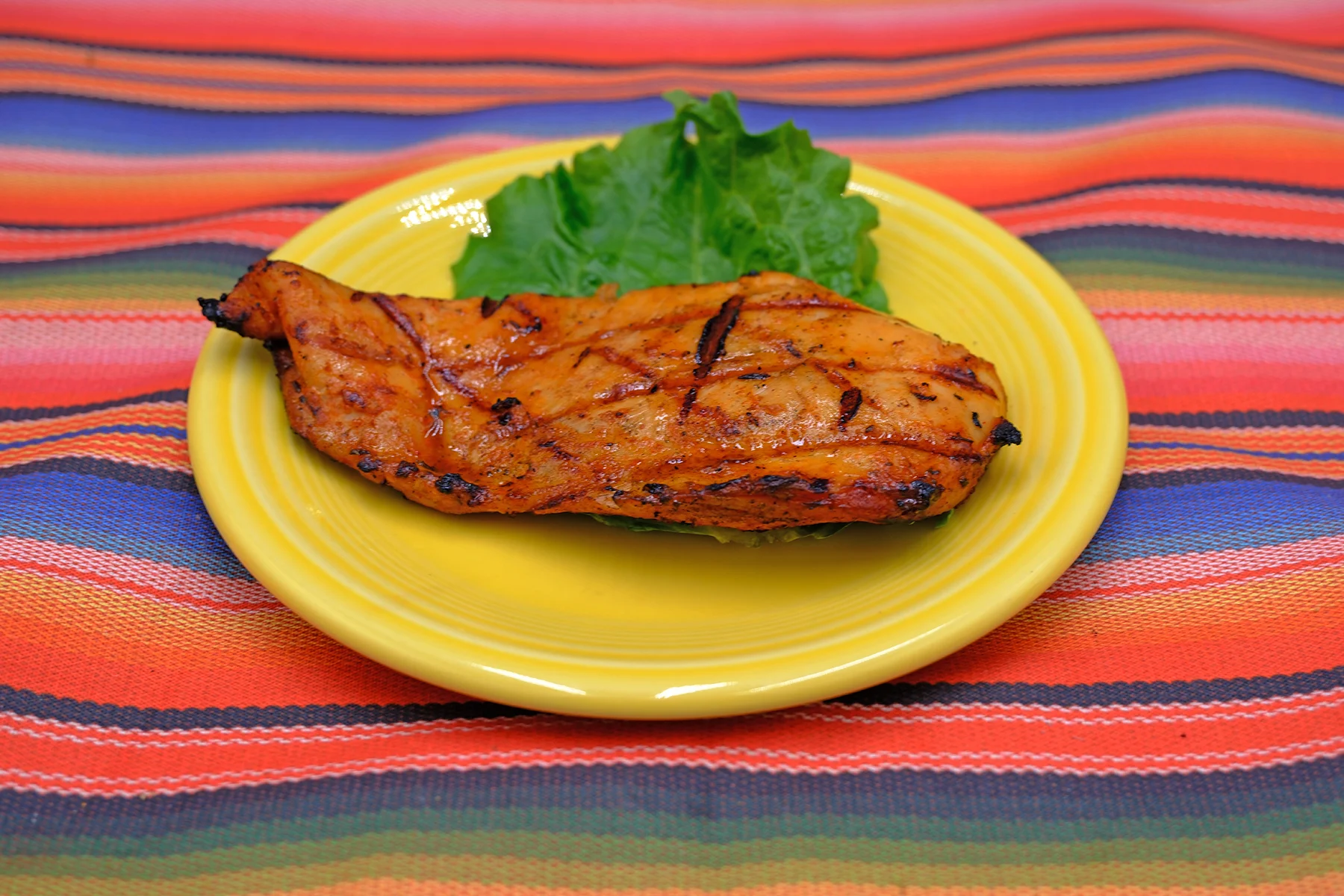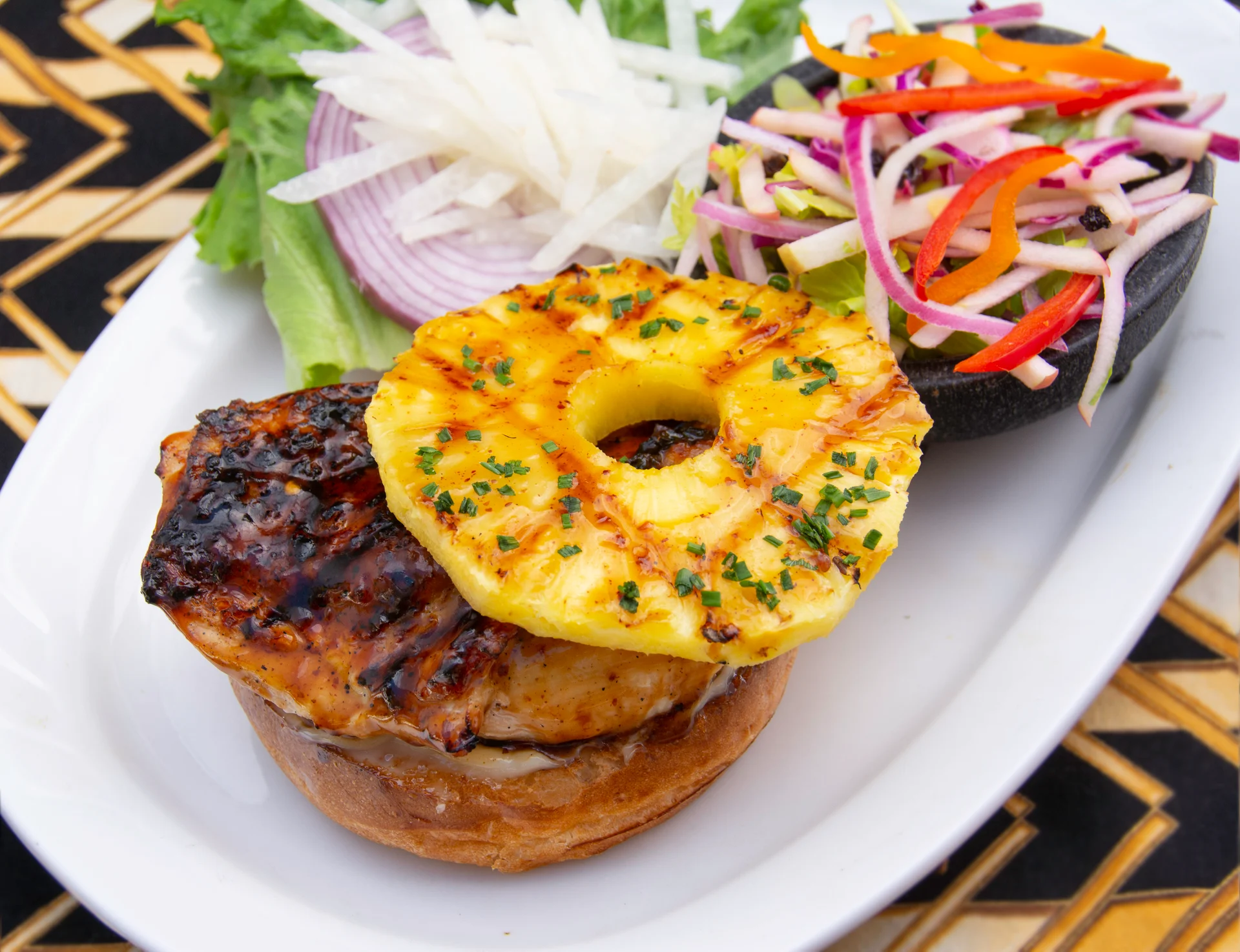 Grilled skin-on chicken breast marinated in a hoisin and ginger glaze. Served with mayonnaise, lettuce, red onion, jicama, and grilled pineapple on a brioche bun