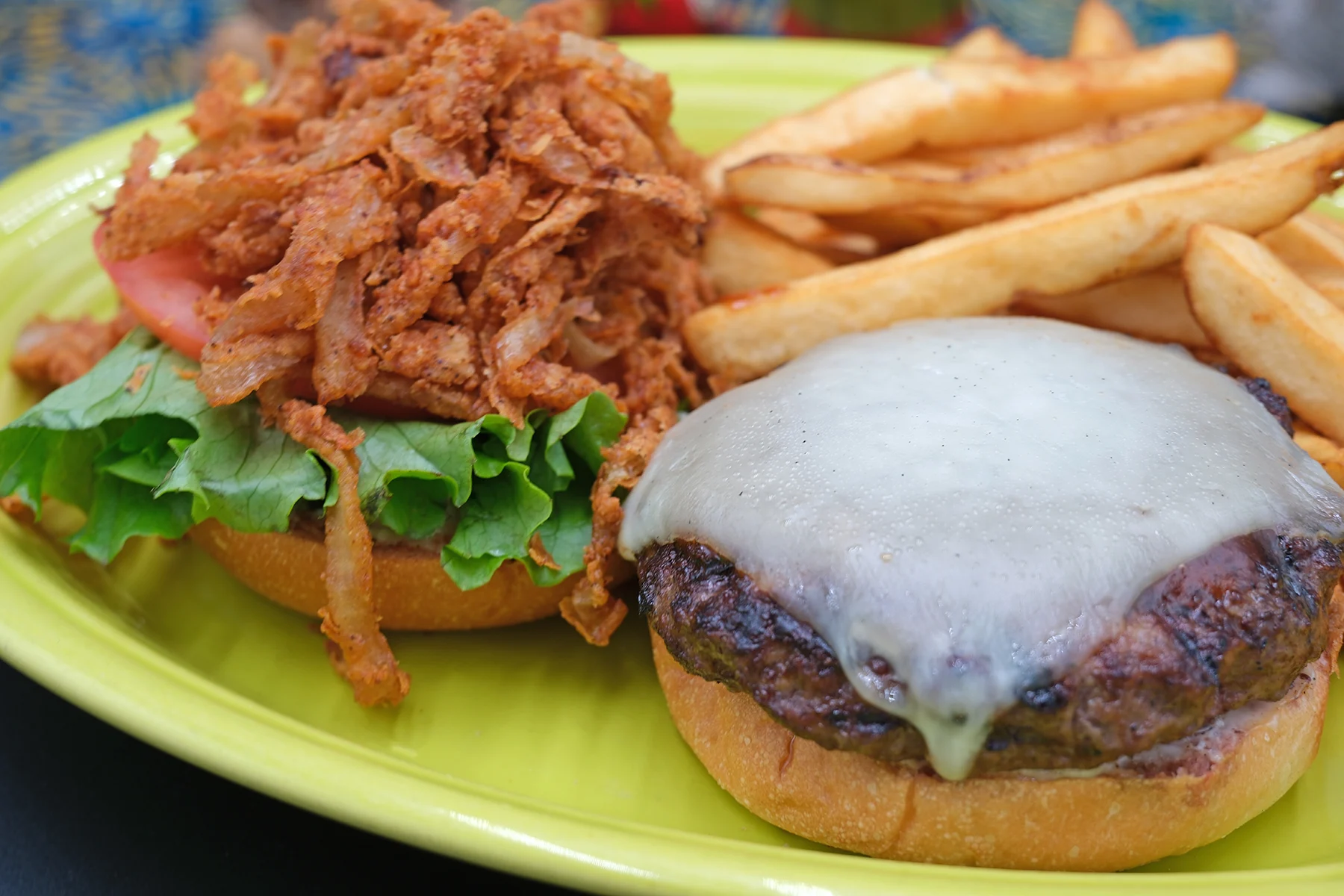 Our half pound burger* topped with our Borracho BBQ sauce (mango, jalapeno and bourbon), jack cheese, crispy onions, lettuce, tomato, and mayo