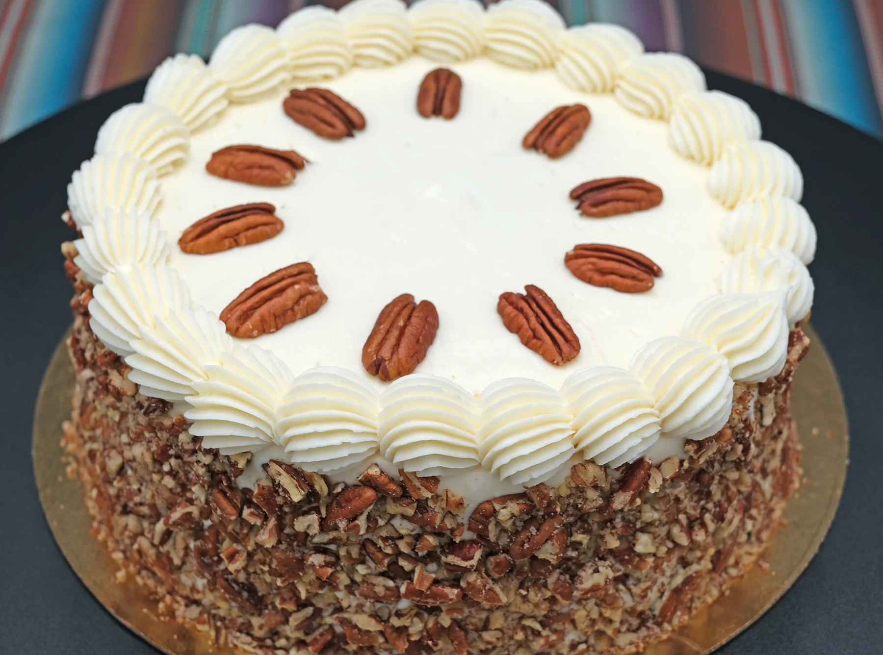 Dense and moist carrot-raisin cake with walnuts, layered and finished with a cream cheese frosting and pecans (contains nuts)