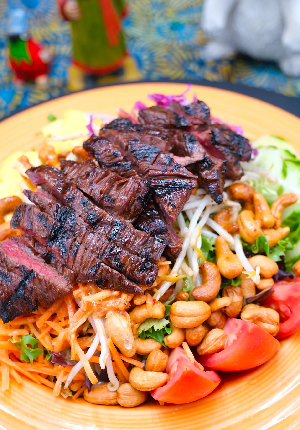 Skirt steak* marinated in Thai sauce, grilled and served on a bed of fresh greens and crispy rice sticks with seasonal fruit, cashews, tomatoes, cucumbers, carrots, red cabbage, bean sprouts and our Szechuan dressing