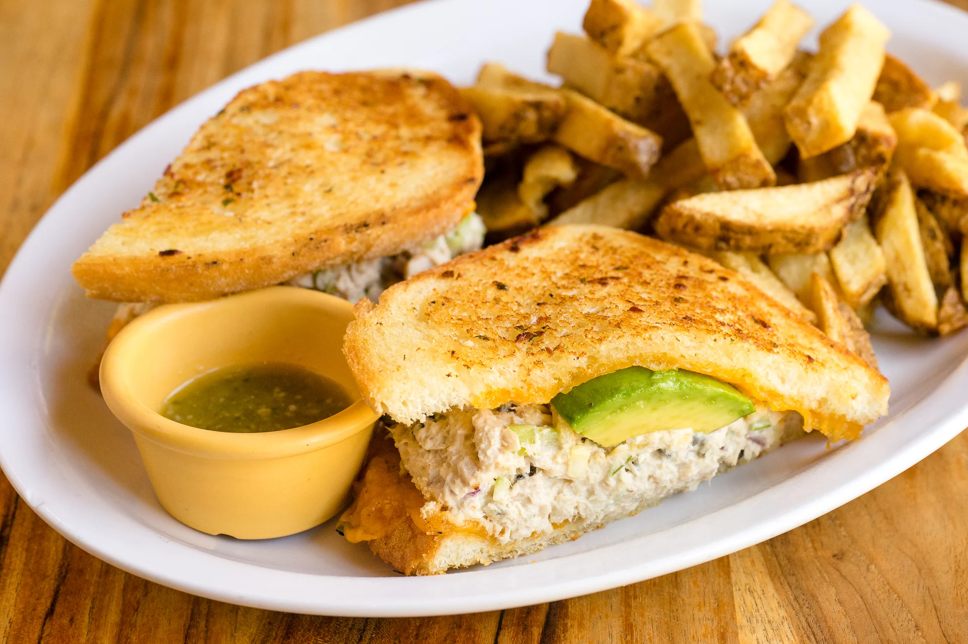 Albacore tuna mixed with celery, onions, olives, mayo, and spices and then topped with cheddar cheese and avocado on grilled garlic bread. Served with cool spice sauce.