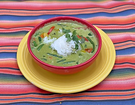 Sauteed chicken breast in a mild green curry with coconut milk, bamboo shoots, bell peppers, carrots, peas, tomatoes, green beans and fresh Thai basil with steamed jasmine rice