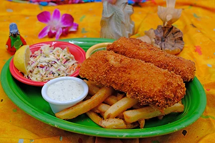 Wild cod in panko batter, fried crispy and served with house-cut fries, Thai basil coleslaw, tartar and cool spice sauce