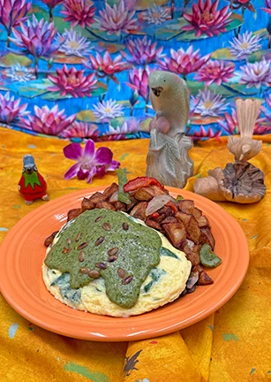Three-egg omelet with spinach, mushrooms, tomatoes, mozzarella cheese, topped with cilantro-pumpkin seed pesto. Served with breakfast potatoes